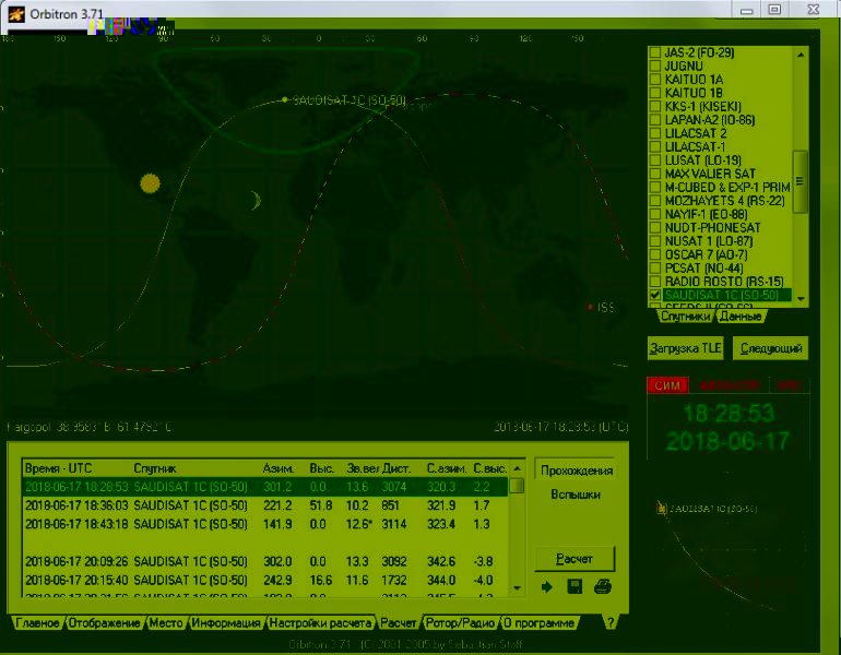 Что это такое? Щелкните по первой строке(уже выделена синим) Получим картинку когда спутник SO-50 войдет в зону видимости моего QTH. Согласно надписи выделенной синим цветом произойдет это 17.06.2018 года в в 18.28.53 UTC. дальше щелкните вкладку ротор-радио. Она следующая. На ней видно, что спутник появится с азимута 301 градус, мода работы спутника и частоты приема-передачи с учетом Допплера. Напомню что в моде FM на допплер при передаче с баофенга можно не обращать внимания. Кроме того справа внизу появилась небесная сфера с траекторией и точкой спутника. Верх север, низ юг, слева запад. справа восток. Она позволяет просто визуально определится на небосводе откуда появится и как пойдет спутник, без всяких цифр-азимутов.