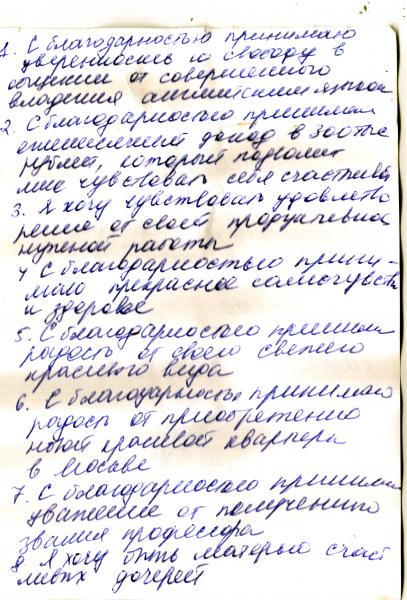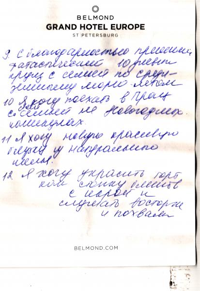 написанной на бланке BELMOND GRAND HOTEL EUROPE ST.PETERSBURG. После того как записку отвязал от ленточки, шарик поднялся и улетел. В тексте не указана дата запуска, но судя по списку желаний (пункт 10) шарик был запущен ещё до нового года. Удивительно, что обычный шарик так долго удерживал гелий.