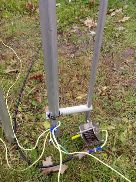 При расположении антенны у земли не обязательно, чтобы радиалы были настроены, достаточно воспользоваться простой формулой расчета 145500/частоту=длина полуволнового диполя, разделив примерно пополам, без учета сантиметров, это неважно, мы получаем длину радиала. Критичность расположения высоты точки подключения радиалов имеет некоторое значение, я все настроил на ту высоту, на которой я могу спокойно обслуживать точку запитки антенны. Настроил не радиалы, а длины проводов антенны. Загибать радиалы всегда можно, об этом у Гончаренко статья есть. Даже можно все разместить на очень небольшой площади. Мне это не требовалось, потому что места было достаточно, да и ставил только на сутки.