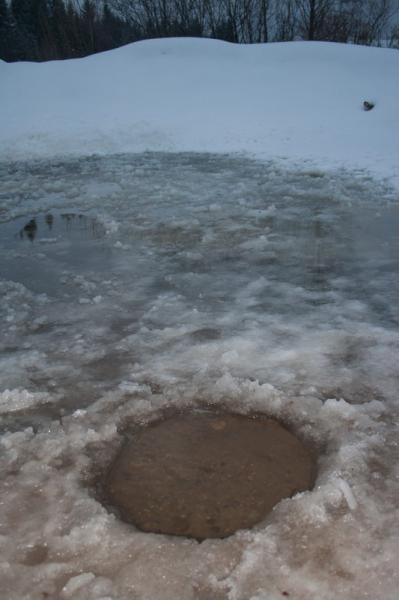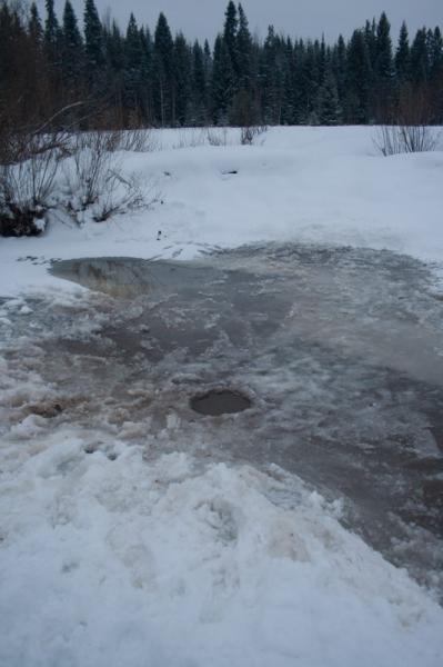 А это так.. по пути на лыжах перехожу речку Грядовицу, так укрепил лёд, залил все водой. Сантиметра 3 льда нарасло. А то трещит лёд. У полыньи глубина то всего ничего, а так там см 50 глубина.