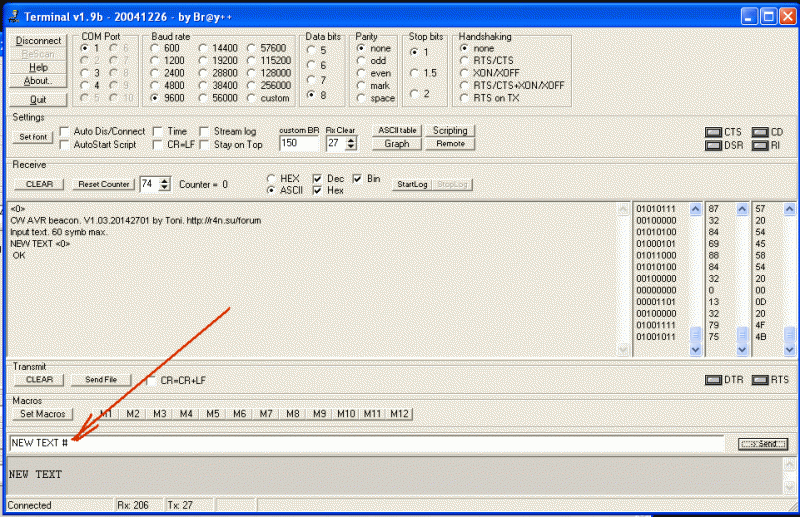 Временно соединяем 28 ногу процессора с минусом (общим проводом), подаём питание на МК. Маяк должен телеграфом передать текст "NEW TEXT", после этого в терминале должно появится сообщение