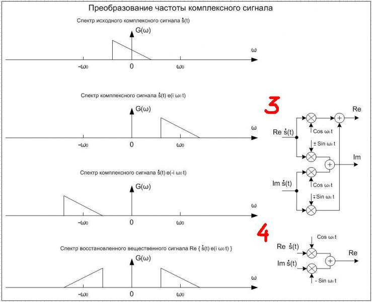 Для того, чтобы так же преобразовать спектр комплексного сигнала, требуется сделать ровно то же самое, т.е. умножить этот сигнал на комплексную экспоненту положительной или отрицательной частоты Wo. Эти случаи рассмотрены на нижнем рисунке на схеме 3, при этом направление сдвига спектра также определяется знаками при умножаемых опорных синусоидах. Схема умножителя при этом усложняется, так как перемножаются уже два комплексных сигнала (оба сигнала содержат действительную Re и мнимую Im части, раскрываем скобки):