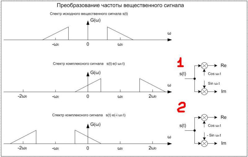 Откуда берется зеркальный канал в обычном (неквадратурном) преобразователе частоты обычного супергетеродина - это знают все. Причина проста - у вещественного сигнала спектр симметричен относительно нулевой частоты. И если мы смотрим на обычную вещественную косинусоиду, мы не можем сказать, какая у нее частота - положительная или отрицательная. Потому что у косинусоиды (равно как и у синусоиды) одновременно присутствуют обе эти компоненты, каждой по половинке. Эти компоненты комплексно-сопряжены, и их векторная сумма всегда дает вещественную (ко)синусоиду (см. формулу Эйлера). Так вот, эта "вторая половинка" и является источником зеркального канала.