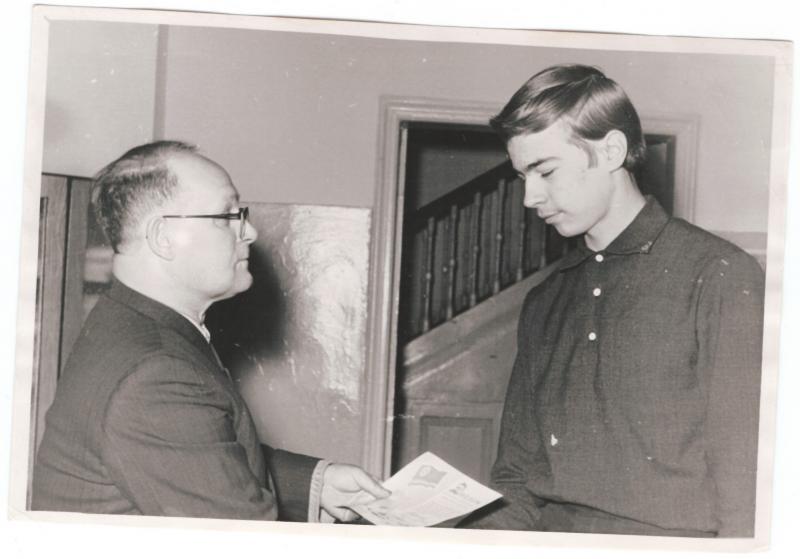 Начальник Кировского областного радиоклуба ДОСААФ Дронин Борис Семенович награждает Олега Дюняшева за 1 место среди юношей по скоростному приему и передаче радиограмм на соревнованиях, посвященных очередной годовщине Советской Армии. 1965 год, февраль.