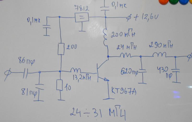 Виктор,приветствую. Скорее всего в Вашей схеме ВЧ-компоненты рассчитаны правильно...А вот смещение на базу мощного ВЧ-транзистора, так ,конечно ,не подают ! (кстати, стабилизатор 7812 при 12 вольтах входного напряжения "ничего не будет стабилизировать ") Сначала нужно определиться, какой сигнал будет усиливать Ваш усилитель. Если только FM- цепь смещения вообще не нужна, просто дроссель нихромовый с базы на землю. (нихромовый-для устойчивости, но не более 0,5 Ома, L- произвольно) Для SSB и АМ сигнала дело намного сложнее, нужно подать смещение от очень низкоомного источника, например ,как здесь :