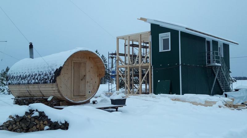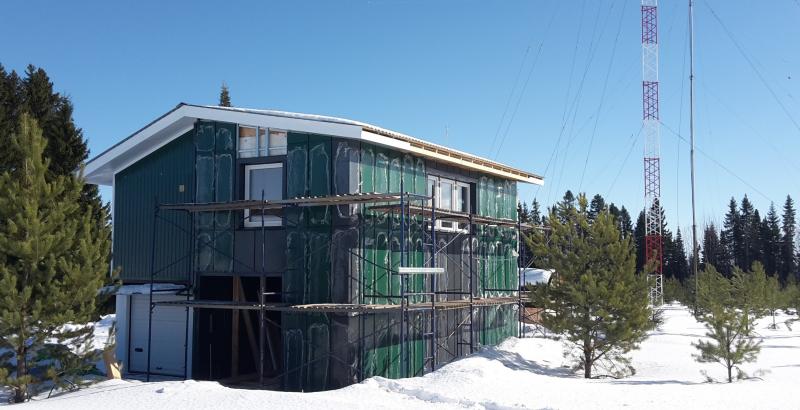 В настоящее время идёт реконструкция технического здания (aka шэк). Сделано дополнительное утепление стен второго этажа и кровли, толщина утеплителя теперь 20 см, под кровлей 25 см. Стало тепло и хорошо, и топить зимой будет менее накладно -)) Фасад заново облицован металлом по технологии "вентилируемого фасада". Установлена толстая тёплая входная дверь. Сейчас монтируется из бруса каркас нового пристроя, размер пристроя по фундаменту 4 х 9 метров. Старое здание и пристрой заводятся под общую двускатную крышу. Общая площадь будет 110 кв. метров на двух этажах.