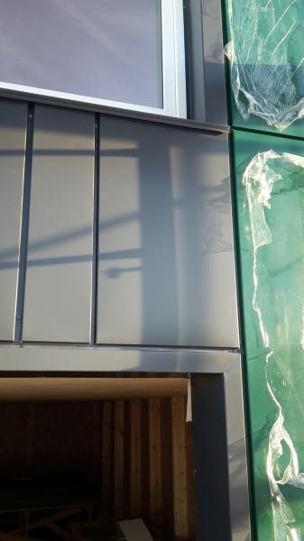 Погожий солнечный денёк. На фасадных металлокассетах ещё не снята защитная плёнка.