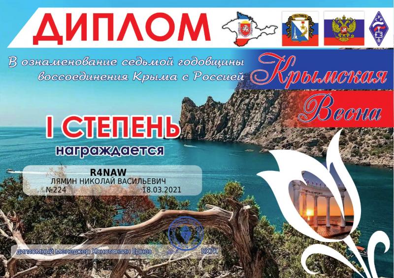 1 степень , необходимо провести 7 QSOс радиостанциями Республики Крым и г. Севастополь или 3 QSO с R2014RK& R2014SE.