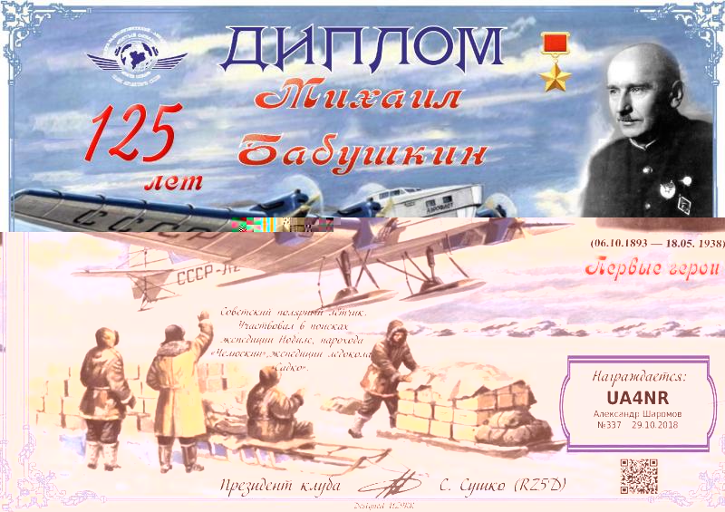 Александр писал(а):Пришёл ещё один диплом,посвящённый полярнику,радистуи радиолюбителю -Э.Т.Кренкелю.Оба диплома получены за работу телеграфом: