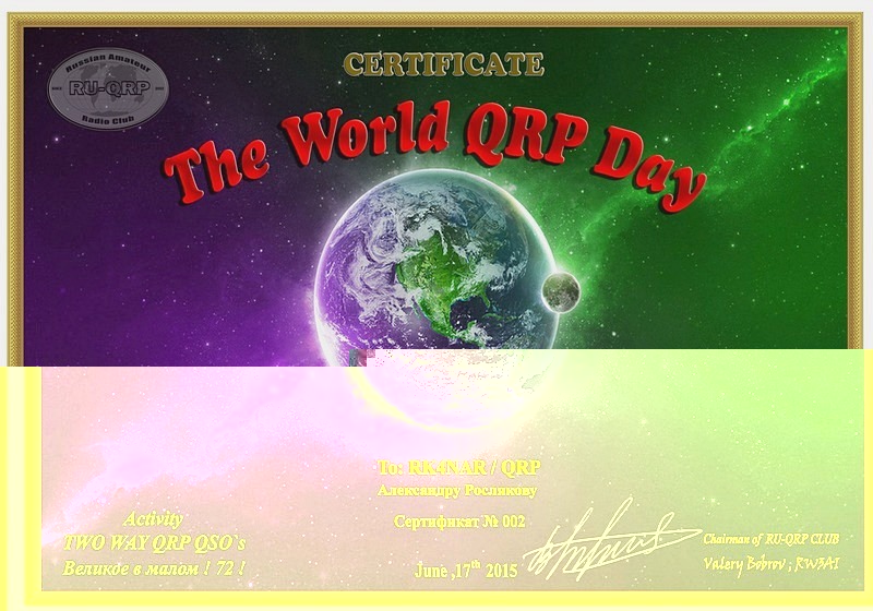 Вот начинающий QRP-ист из Нагорска, Александр, такой Сертификат получил....(великое-в малом) Может Кировские QRP-зубры отметятся своими достижениями ? 72! 55! 44!