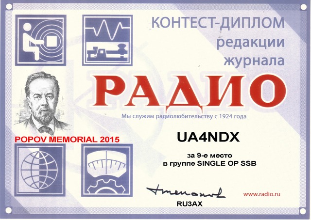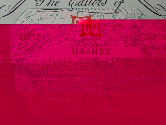 Товарищ -мистер Barry Merrill W5GN ,видимо решил со мной "рассчитаться за всё" .... Вдруг за 2013 решил диплом прислать,только за 160м первое место по Европ. России.. Мелочь, а приятно. P.S. Сделан на "верёвку" 85 метров. Цена антенны- рублей 150. Ни одного "общего вызова",только на поиск. 100 ватт + самодельный компрессор аудио (+10 dBV) 73 All.