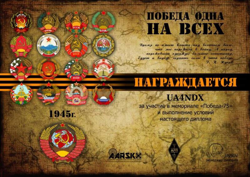 Ну, вот и закончился Мемориал "Победа-75"....Как могли -поучаствовали, эту дату невозможно пропустить. Василий Васильевич ,видимо приготовит общую статистику работы команды? Я , из-за слабости своих антенн, пару дней уделил работе "на себя" (т.к. мне просто перестали отвечать на RP75KF) Конечно ,2х-3х дней было достаточно ,чтоб выполнить все дипломы Мемориала....(почти все Кировчане выполнили базовый диплом) Получил ещё один диплом,от Казахстана, который очень понравился по дизайну...И немного своей статистики в табличке . 73! с Великим Праздником, друзья !