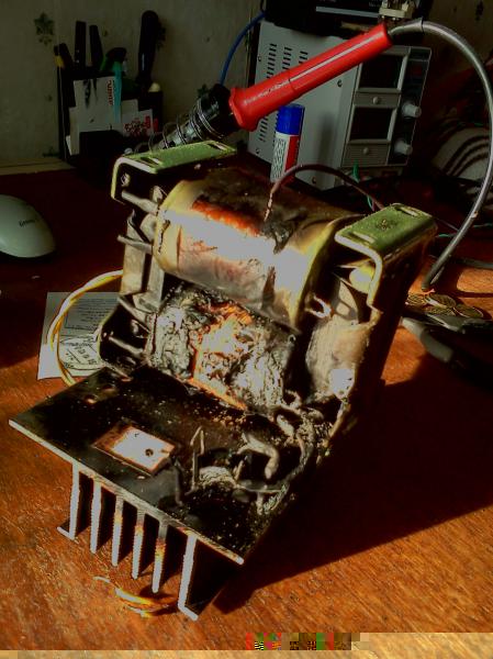 На фото плохо видно хорошо прожаренный диодный мост. Возможно с него всё и началось. Перед тем как закоптится, репитер фонил, наверное, месяца полтора-два. Ещё не понятно почему изжарилась только одна обмотка трансформатора?