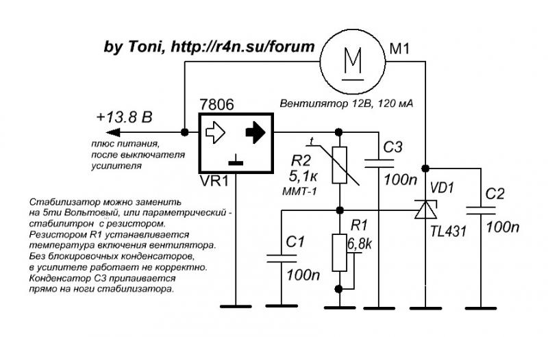 Небольшое дополнение. Максимальный ток для TL431 по даташиту 150 мА, поэтому использовать вентиллятор с бОльшими значениями потребляемого тока не желательно.