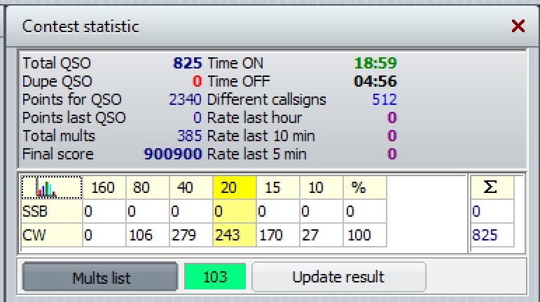 Впервые попробовал в телеграфе - 24 щсо и 16 - в ссб. 20м 100Вт s&p. Был очень ограничен во времени, хотя даже только на 20ке еще можно было много наколотить. :pardon: