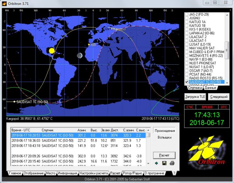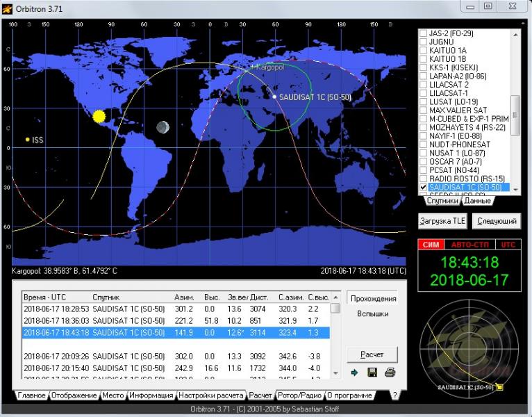 Что это такое? Щелкните по первой строке(уже выделена синим) Получим картинку когда спутник SO-50 войдет в зону видимости моего QTH. Согласно надписи выделенной синим цветом произойдет это 17.06.2018 года в в 18.28.53 UTC. дальше щелкните вкладку ротор-радио. Она следующая. На ней видно, что спутник появится с азимута 301 градус, мода работы спутника и частоты приема-передачи с учетом Допплера. Напомню что в моде FM на допплер при передаче с баофенга можно не обращать внимания. Кроме того справа внизу появилась небесная сфера с траекторией и точкой спутника. Верх север, низ юг, слева запад. справа восток. Она позволяет просто визуально определится на небосводе откуда появится и как пойдет спутник, без всяких цифр-азимутов.