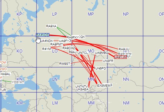 Сегодня, 21 -го июля порадовал нашу область спорадик снова....У меня комплектная связь довольно хорошая : RW9UI 144300.1 UA4NDX [AS] Asiatic Russia (2314Km) LO48TO<ES>NO33HU 59/58 13:28z Поговорили долго , минут 5 ,с замираниями, конечно, Владимир из Кемерово... Ещё он "подогнал" двоих из области своей в SSB - RA9UKW, RA9UIX, но они меня слабо принимали......Других областей Сибири нисколько не слышал, только эту... Картинка связей была загляденье ! Видео не успел, конечно записать...Но карта есть на это время-