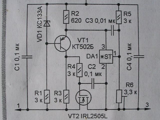waleri , для такой простой ,и "одноразовой" конструкции ,думаю нет особой надобности делать печатную плату,а мне изучать splan .. Но стабилизатор хорош! После доработки -схема выложена ниже. Детали оптимизированы для минимального "отклика" стабилизатора при снятии и подключении нагрузки 10А, характеристика получилась существенно лучше, чем у автора Нечаева- download/file.php?id=1092&mode=view Что было изменено : Убрана регулировка выходного напряжения,т.к.потенциометр- ненадёжная деталь,и всегда есть соблазн "что-то покрутить",а блок питает серьёзную,дорогую аппаратуру,надёжность-на первом месте... Транзистор КП303Г снижает пульсации 100 Гц на выходе с 80 до одного милливольта. МП26 применён не по жадности,просто его рабочая частота не более 0,5 МГц,что хорошо сказывается на устойчивости схемы. Ещё рекомендации : С1 выбирают из расчёта 3000 Мкф / на ампер потребления(эмпирическая формула) ,С2- прямо на выходных клеммах, снимает остаточный шум стабилизатора. Диоды Шоттки SBL3040PT в мосте позволяют выходной ток хоть до 50А (шунтировать конденсаторами 0,1 Мкф, и параллелить диоды в сборке,монтировать с прокладками,на радиатор при токах более 10А. Большое достоинство схемы- питание от трансформатора на 12,6 вольта,т.е. после моста -на С1 всего 16 вольт ! На токах 20 и более ампер-надо уже делать "мягкий пуск" - т.е просто ставить китайское реле на 12 в DC на выход- а контакты его должны перемыкать резистор последовательно первичке (20-50 ом) Иначе любые диоды сгорят. Предохранитель- ПР1- на рабочий ток. Силовой транзистор - IRL1404 ,при токах более 25А- приходится монтировать на медную пластину, а уж её на Al радиатор (всё с пастой КТП-8) Если мало напряжение-просто один из стабилитронов замените на КС168- будет 13,8 вольта. Схему в Кирове повторяли минимум 3 человека,каждый по своему ,но авторский вариант. (именно на 25А) Даже при аварии -напряжение на выходе- безопасно для практически любой р/любительской техники. Схему "обдува" применяю вот эту : http://dl2kq.de/pa/1-19.htm (на 5 А-вообще не нужен вентилятор) 73 конструкторам !