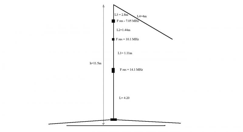 Что удалось экспериментально заметить в процессе настройки и эксплуатации. Самый ВЧ диапазон, то есть 20м, должен иметь 1/4 длины примерно 5,2м, но, как мы видим, длина до трапа получилась 4,2. Что это? ошибка расчета? Не думаю. Не учитывались определенные факторы. Затем, когда все было настроено на 3 диапазона, удлинил антенну до 80м диапазона. Другие диапазоны "не почувствовали" этого изменения, но только не 20м. Его КСВ по реальным данным (это, конечно, не самый хороший показатель, но иного у меня не было) антенны ушла вниз на 20м. То есть она "удлинилась". Может на 30 и 40 это и не было заметно, но 20м диапазон это почуял.