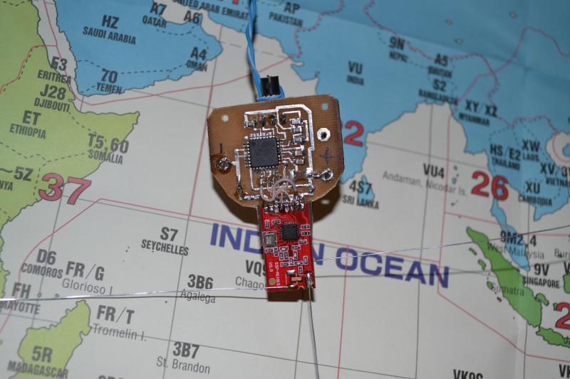 Решил поменять платформу, теперь в качестве МК трудится ATmega328, на китайском клоне ардуино. Стоит недорого, небольшой размер, 32 кб памяти программ, от 8й атмеги сильно не отличается. Сам передатчик расположен в 3.5 км от места приёма, мощность так же 10 мВт, приём ведётся на сибишную четвертушку на крыше и FT817 в качестве приёмника. На плате передатчика заменил кварц, в результате частота стала плыть меньше после "прогрева" - есть уход частоты некоторое время после включения.