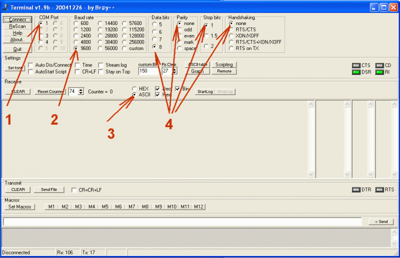 Выбираем COM порт, к которому подключен переходник RS232->TTL, скорость обмена Baud rate=9600, Data bits=8, Parity=none, Stop bits=1, Handshaking=none. Выбираем кодировку ASCII.