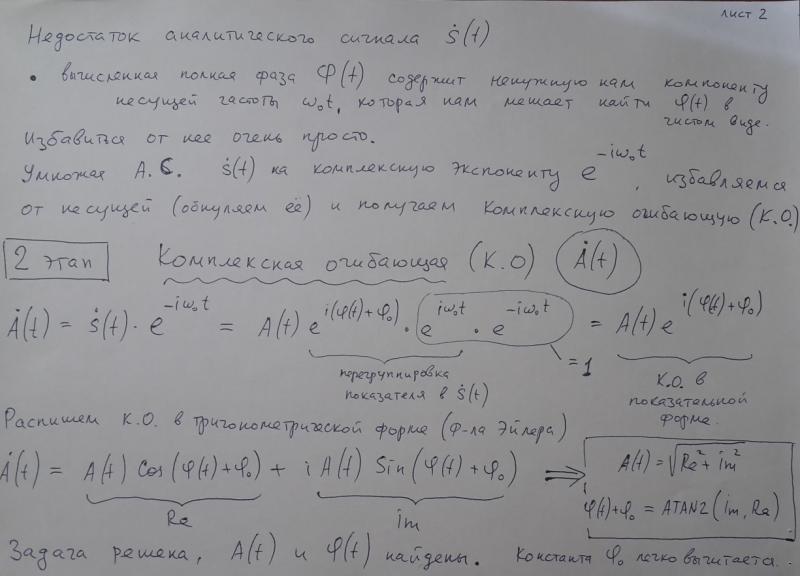 Комплексный аналитический сигнал (А.С.) можно получить из исходного вещественного сигнала добавлением к нему мнимой части в виде сопряженного по-Гильберту дополнительного сигнала. Комплексную огибающую (К.О.) - complex envelope, можно получить из А.С. путем сдвига его спектра влево на величину (омега ноль). А можно - и более простым способом, непосредственно из вещественного сигнала при помощи схемы квадратурного демодулятора.