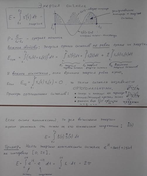 На первом слайде даны формулы для вычисления энергии вещественных и комплексных сигналов с картинкой и примером решения задачи. Дана формула для вычисления взаимной энергии двух сигналов (она же есть скалярное произведение этих сигналов).