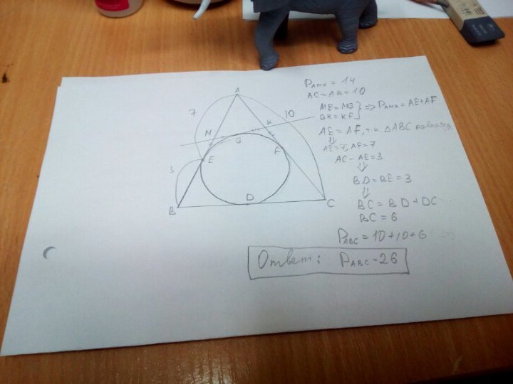 Примечание - в оригинальном школьном варианте задачи прямая MK идёт параллельно основанию треугольника BC. В моём варианте - угол наклона произвольный. Можно начать со школьного варианта, но принципиальной разницы в ходе рассуждений нет. Никакой тригонометрии, синусов, косинусов использовать не нужно. Только логику и здравый смысл. D, E, F, G - обозначены точки касания окружности.