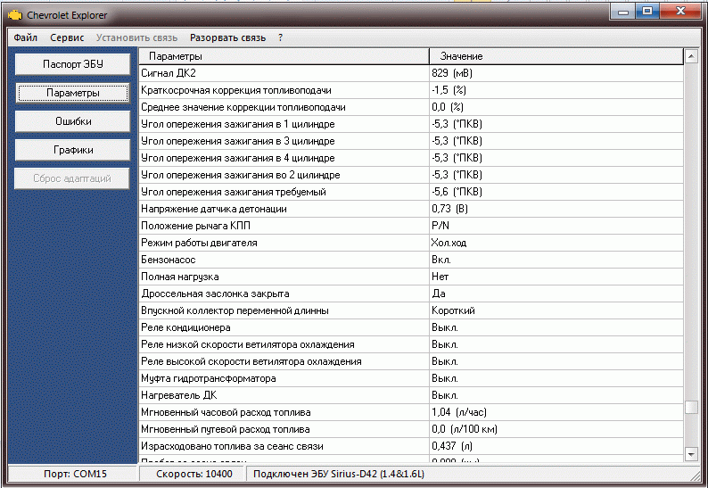 Программа позволяет в реальном времени смотреть множество параметров и строить графики их изменения во времени в зависимости от режимов работы двигателя, читать и сбрасывать ошибки ЭБУ, читать идентификационные данные.