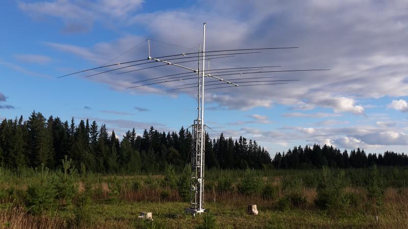 На мачте на общей антенной стойке две вращающиеся антенны YAGI от "Антенна Депо" на 7 диапазонов: 40м - 3 эл., 30м - 2 эл., 20м - 4 эл., 17м - 3 эл., 15м - 4 эл., 12м - 4 эл., 10м - 6 эл. Элементы 40 и 30 метрового диапазонов укороченные. Поворотное устройство BIG RAK. Коммутация антенн наверху, вниз идёт один фидер 8D-FB длиной 80 метров. Общая масса антенн 100 кг, площадь ветровой нагрузки антенн 4 кв. м. Антенная стойка черырёхслойная, из четырёх вложенных труб ДТ-16.