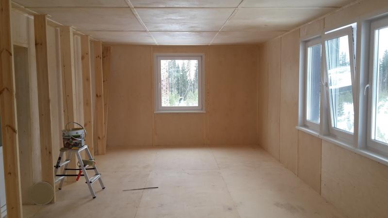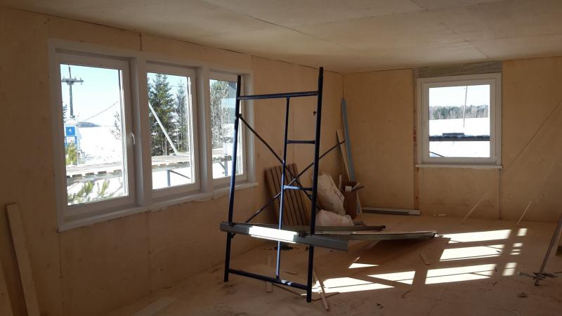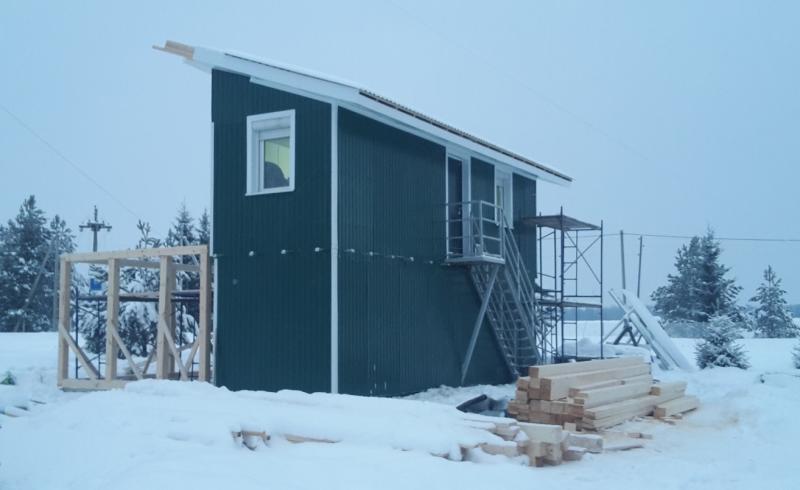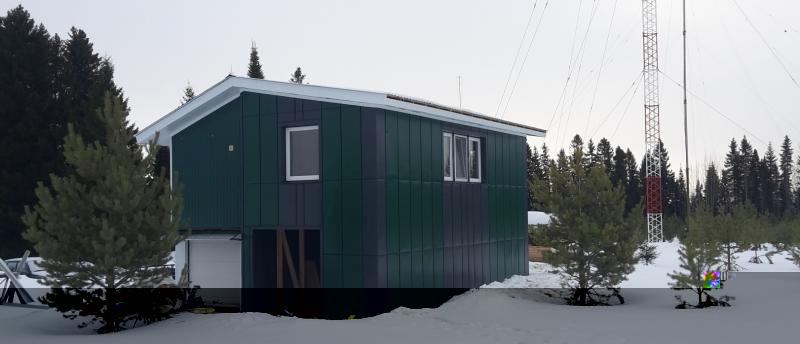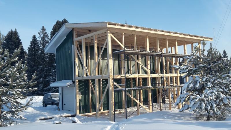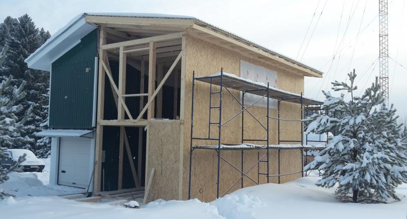 В настоящее время идёт реконструкция технического здания (aka шэк). Сделано дополнительное утепление стен второго этажа и кровли, толщина утеплителя теперь 20 см, под кровлей 25 см. Стало тепло и хорошо, и топить зимой будет менее накладно -)) Фасад заново облицован металлом по технологии "вентилируемого фасада". Установлена толстая тёплая входная дверь. Сейчас монтируется из бруса каркас нового пристроя, размер пристроя по фундаменту 4 х 9 метров. Старое здание и пристрой заводятся под общую двускатную крышу. Общая площадь будет 110 кв. метров на двух этажах.