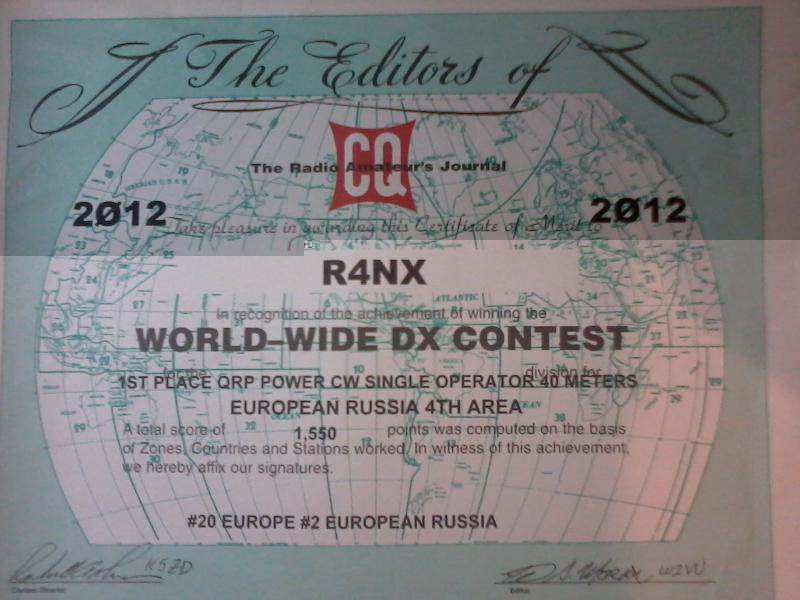 Тоже вот хочу похвастать...(но это бумажный диплом, правда за первое место по евр. России...) Скоро в городе такие дипломы не заработать, т.к. начались "гонения" на любительские антенны....А этот сделан на "невидимую " антенну -Луч 85м. (в этом году добавился соперник на 160м- RK4NAB, с вертикалом, естественно, он меня обошёл круто : у него и Эмираты и Катар, и Кувейт и Китай, я их не взял..) Да и Русских на 160м-зачёте добавилось: вместо 8-9 чел в 2011-м, нынче было в этом контесте наших чел. 15-18....Но через месяц CW WW contest ! Заявляйтесь НА ОДИН диапазон, (где у Вас лучшая антенна) -и в пятёрку -десятку попадёте!
