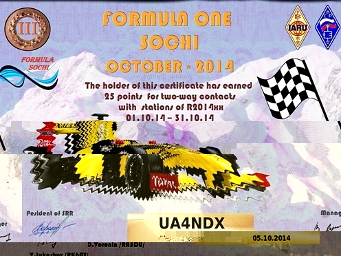 15 октября закончилась акция " Формула-1 " Как-то никто и не вспомнил...Лидирует из Кировчан - RN4NA (25 -место в ТОП-100 ! Ещё попали в сотню UA4NBA (51) и UA4NDX (74)....UA4NF - немного не достало до ТОП-а.. Это из 10333 Российских участников ! НУ, а "первый диплом" ихний -почти все выполнили. (RW4O-Андрей ещё и "пилотом" поработал за UE16SF..) http://f1award.ru/ -сайт ещё работает, и распечатать на бумагу свои недорого ,около 25 руб А4 . Остались Сочинские R2014хх , но там дипломы пострашнее .. http://f1sochi.hamlog.ru/ Всем успехов!