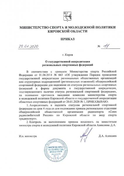 Сегодня из Министерства спорта и молодежной политики Кировской области прислали копию Приказа от 20 января 2020 года № 11 "О государственной аккредитации региональных спортивных федераций"